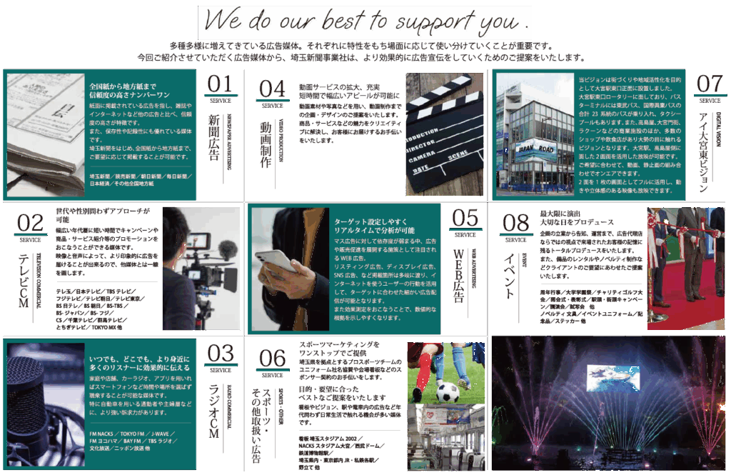 1977年の設立以来、47年間、埼玉県を主要地盤として、プロモーション事業を行い、埼玉県内の主要マスコミ媒体の広告代理店として、お客さまのご要望にお応えしてまいりました。