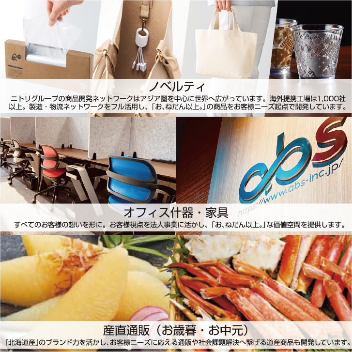 ニトリグループの一員としてニトリをはじめとした一般企業の販売促進や物品調達を支えています。ニトリグループが持つ様々なリソースと、独自の知見を活用しながら、お客様にとって最適な形に変換して新たな価値を提供します。お客様の最も信頼できるパートナーになることを目標にしています。