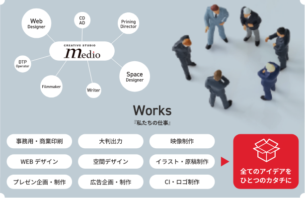 クリエイティブ・スタジオとして、常にチームマネジメントを心がけています。人は進化を続け、世の中には多くの技術やアイデアが溢れています。しかし時間は限られています。その中から一人で最善の方法を探し続けるのは困難です。一人では難しいことでも、周りを見渡せば多くの才能あふれる仲間がいます。クライアントの希望を叶え、より高い効果を生み出すために、私たちはチーム一丸となって多くのアイデアを創造し続けます。